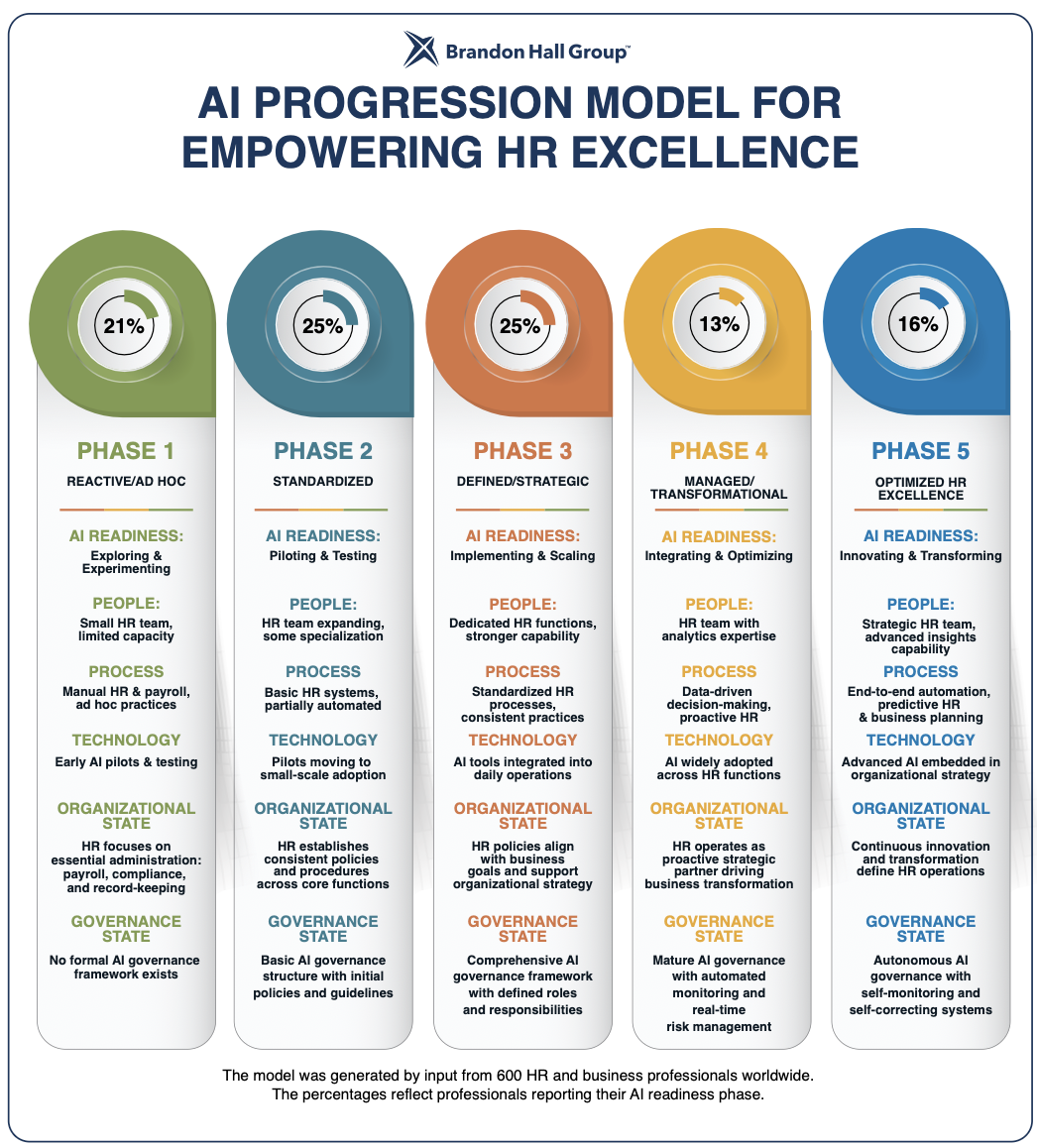 BOCA RATON, FL, Sept. 24, 2025 (GLOBE NEWSWIRE) -- Brandon Hall Group™, the leading independent HCM research and analyst firm, today announced the release of its AI Progression Model for Empowering HR Excellence, a comprehensive framework that maps the five distinct phases of AI maturity in human resources. The model provides organizations with a structured pathway for evolving their human resources function from a reactive, administrative role to a fully optimized, innovative strategic partner. The model was generated by input from 600 HR and business professionals, worldwide. The research reveals a significant progression lag in AI adoption across HR functions, with 46% of organizations still operating in reactive or basic standardized modes (Phases 1-2), while only 16% have achieved optimized HR excellence through AI integration (Phase 5). Notably, organizations that reach Phase 3 with strategic AI alignment report universal success in their implementations.