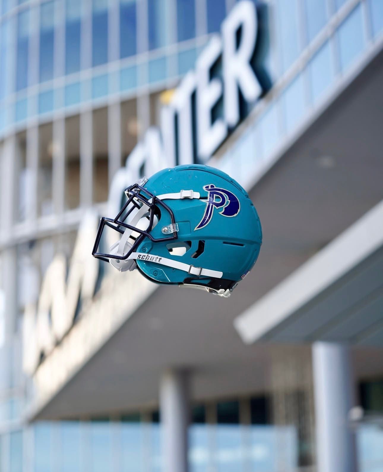 Orlando Pirates helmet displayed outside the Kia Center, where the team will host its debut game on April 5.